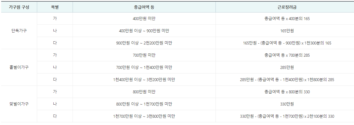 단독가구, 홑벌이가구, 맞벌이가구의 총 급여액 등에 따라서 지급되는 근로장려금 액수가 다릅니다. 계산식은 아래의 표를 참고하시면 됩니다. 본인의 총 급여액을 입력하여 직접 근로장려금 계산기를 통해 계산해 보실 수 있습니다. 또한 근로장려금 산정표를 통해 본인의 급여액에 따른 예상 지급액을 대략적으로 확인하실 수 있습니다. 아래 버튼을 통해 근로장려금 지급액을 계산해 보시기 바랍니다.