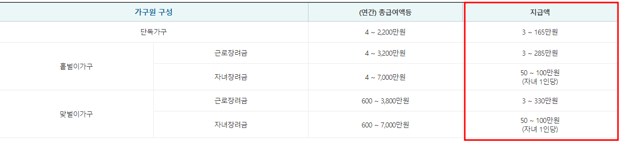 ※ 가구 당 기준금액 및 근로장려금 자녀장려금 지급액